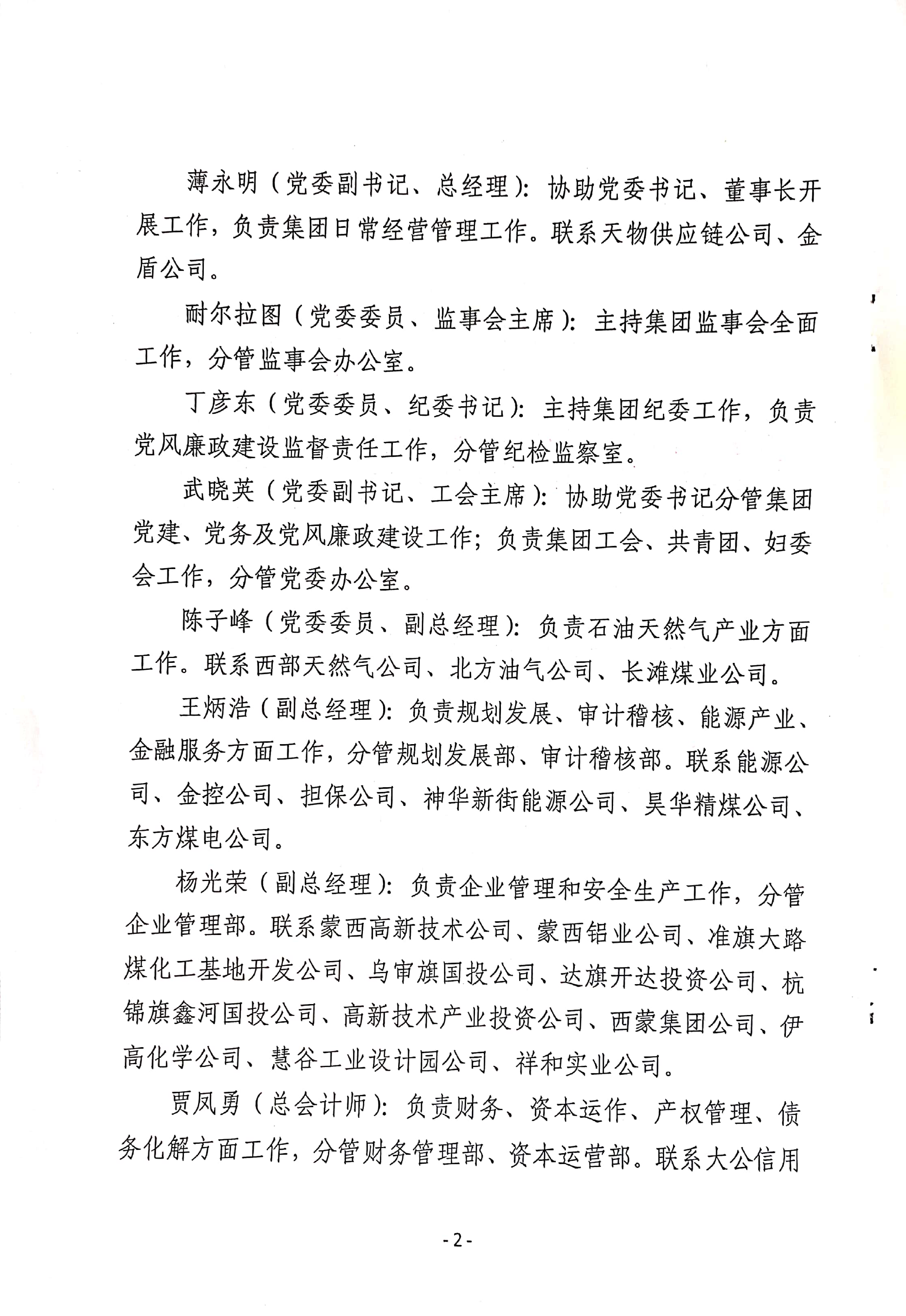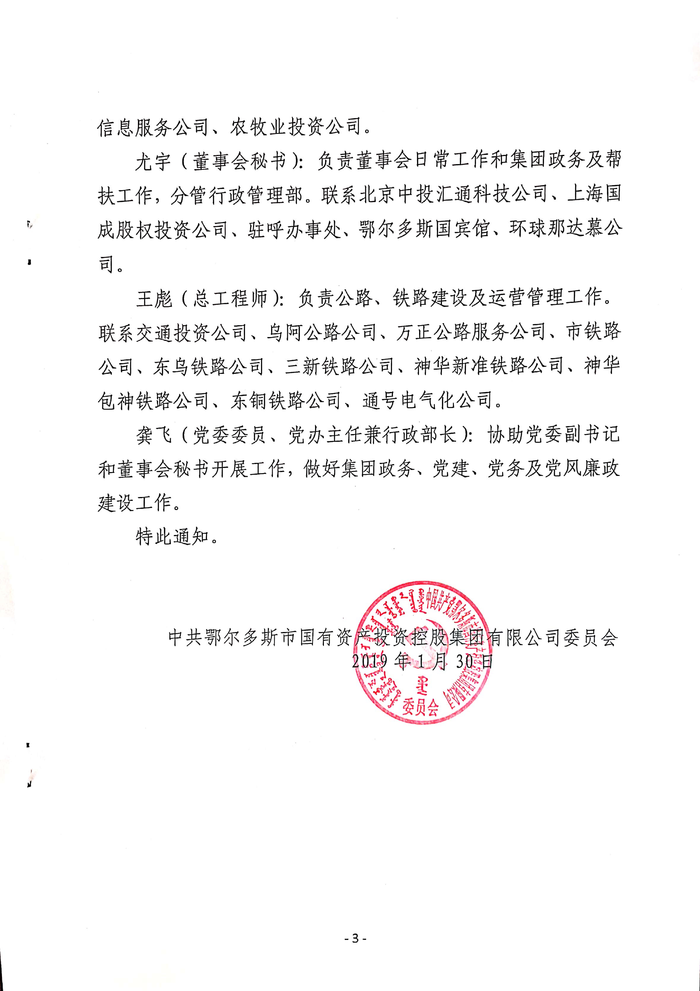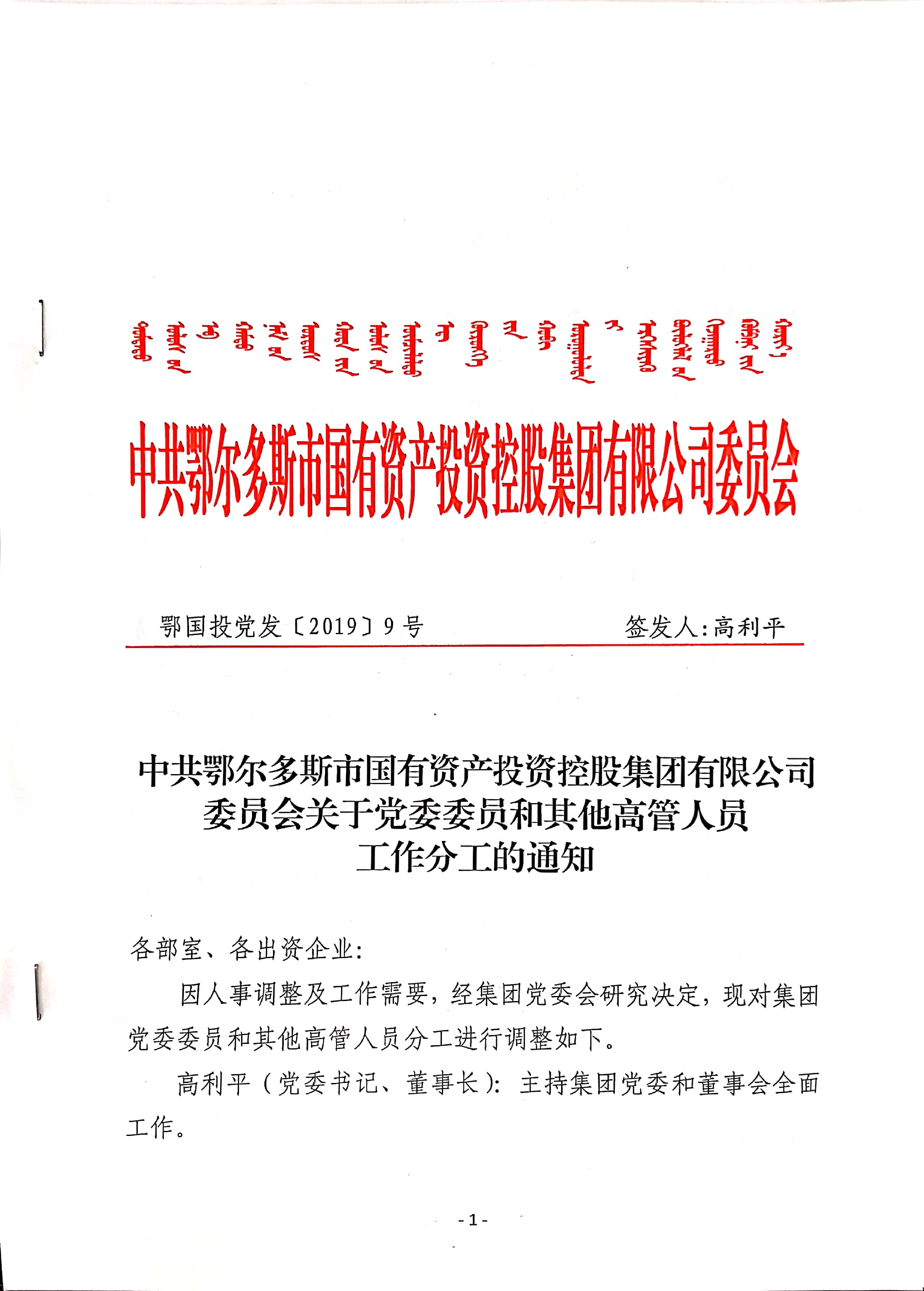 中共鄂爾多斯市國有資產(chǎn)投資控股集團有限公司委員會 關于黨委委員和其他高管人員工作分工的通知